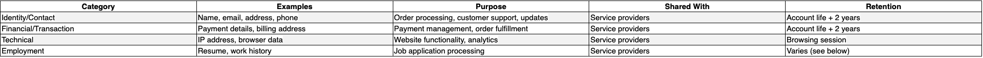 Employment Data: For job applicants, we collect work history, education, contact details, demographic info, and resume/application data.